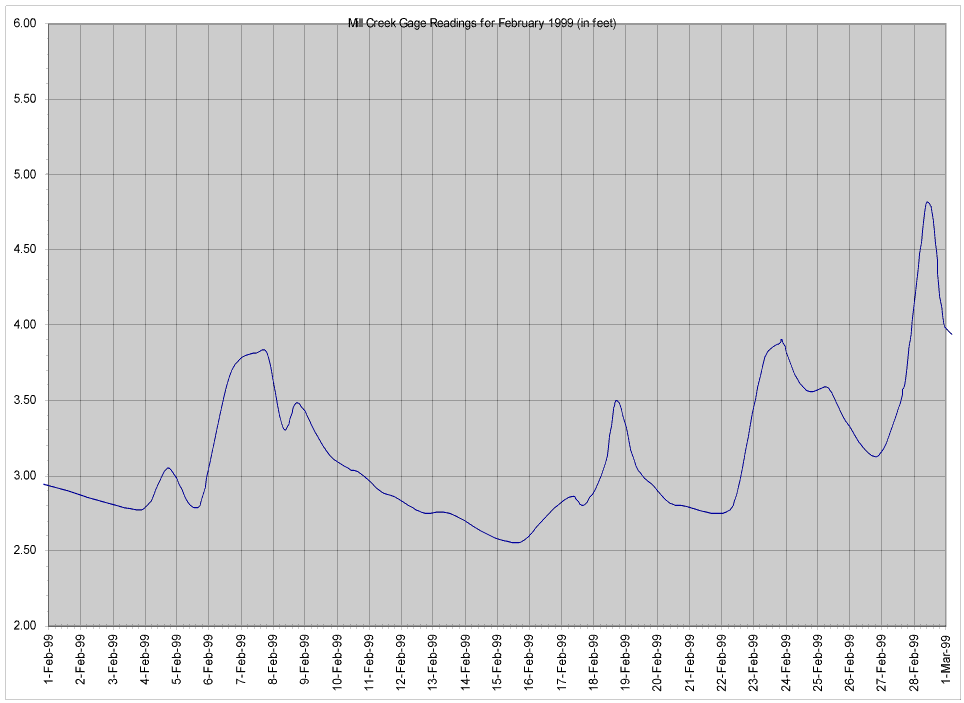- 4.3 feet is flood stage (creek is starting to come over its banks in